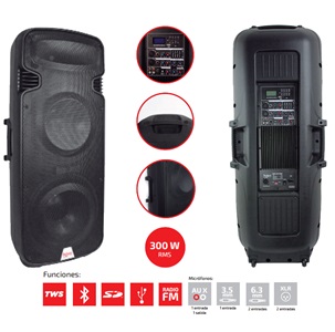 BAFLE AMPLIFICADO SEMI-PROFESIONAL 3 VIAS, 300W RMS, DOBLE WOOFER DE 15", ECUALIZADOR DIGITAL EN MODO BT, ECUALIAZDOR GRAFICO DE 5 BANDAS, 1 SALIDA A