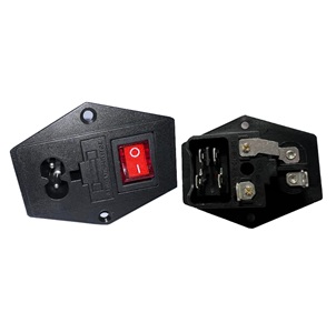 CONECTOR INTERLOCK MACHO PARA CABLE DE EQUIPO DE COMPUTO CON PORTAFUSIBLE TIPO EUROPEO E INTERRUPTOR DE BALANCIN ROJO DE 1P1T, 2 PIN, 250 Vac A 10 AMP